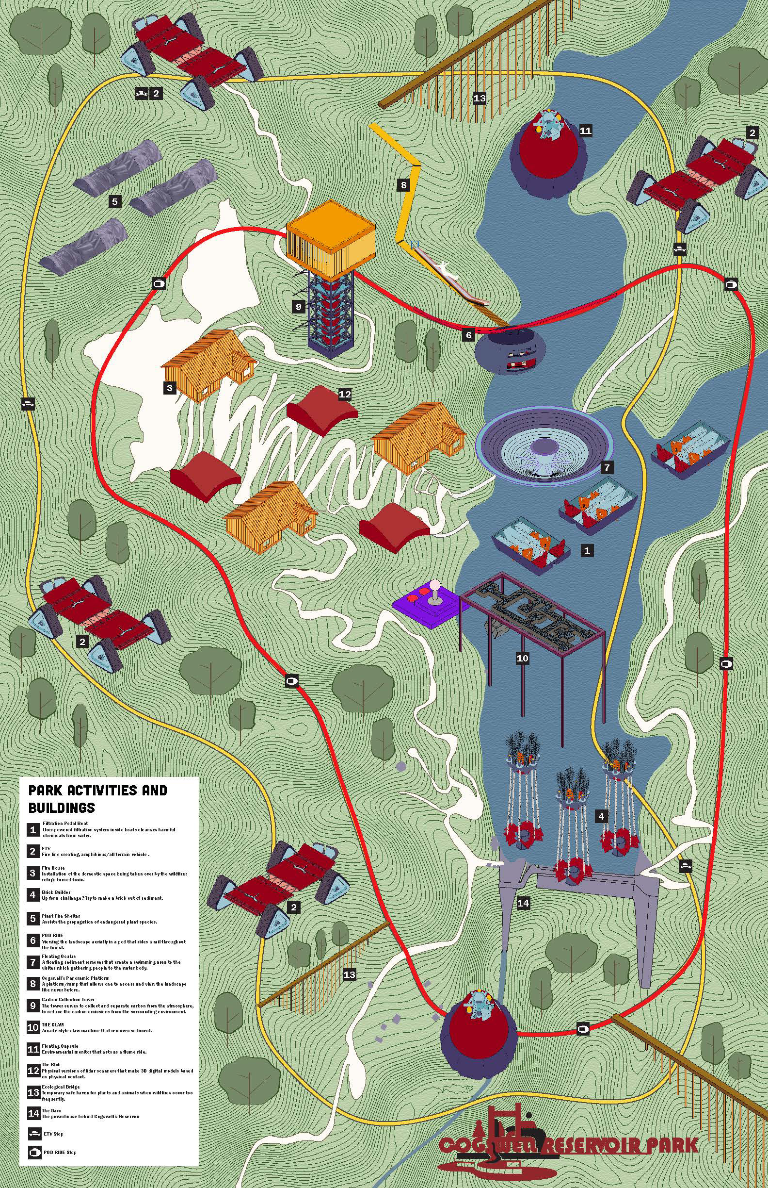 Before designing the “Firehouse Experience”, I designed a ramp that conformed to the steep surrounding landscape, allowing people to access the activities available on the platform that encouraged people to engage with their surroundings and with one another, fostering a sense of community and strengthening the bond between people and the environment.