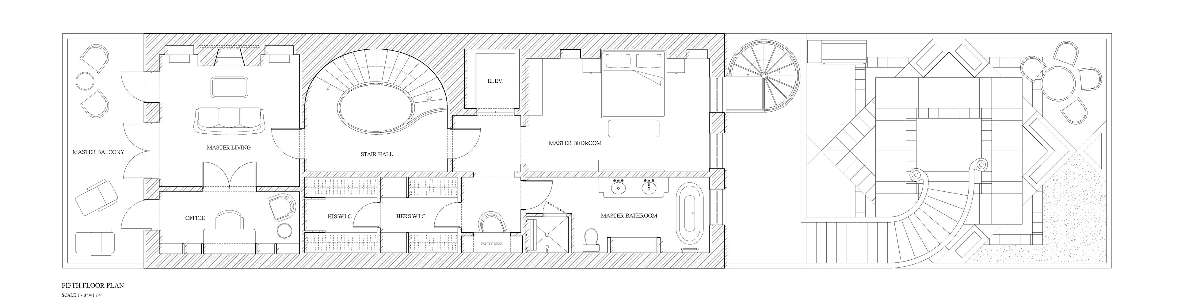 Additional connections include a spiral staircase from the third-floor library, which links directly to the second-floor balcony, further weaving together the entertaining spaces. On the top floor, the master suite includes a more private balcony facing the street, which, when seen in section, creates a layered, stepped progression of terraces across the building’s elevation.